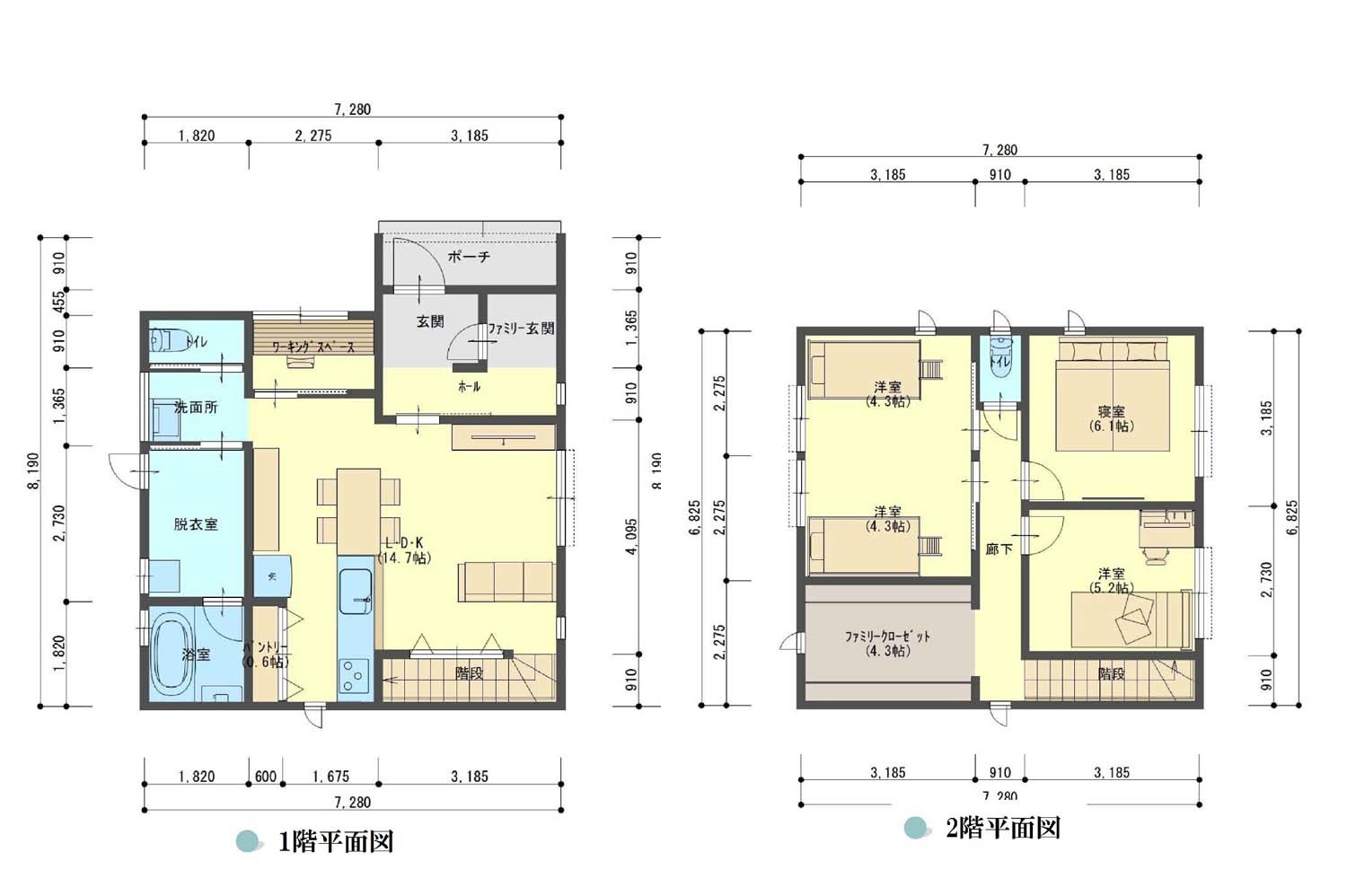 | 間取り | 3SLDK 1F LDK19.24、浴室、 洗面脱衣、トイレ 2F 寝室7.5、洋5.3、 サロンコーナー5.0、WIC3.13 |