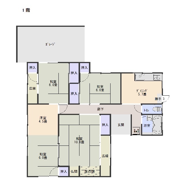 | 間取り | 5DK 1F DK5.7、和6.0×3,和10、 洋4.5,風呂、トイレ、ガレージ |