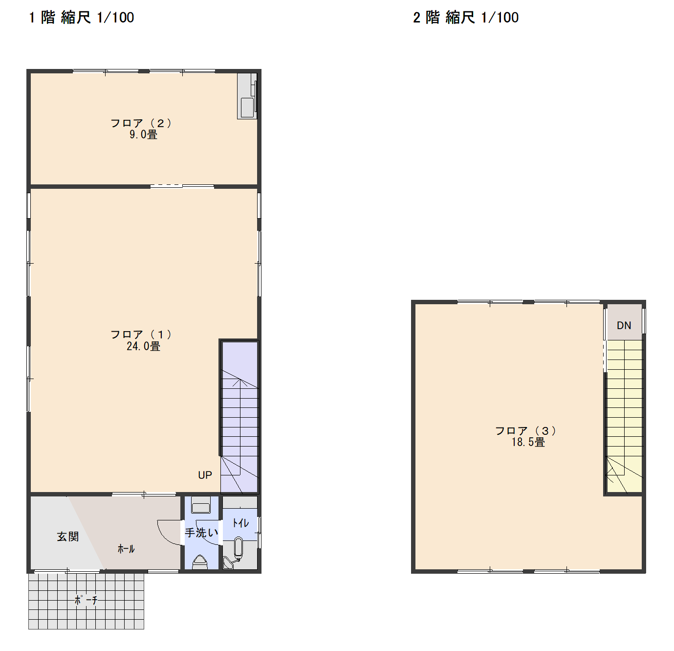 | 間取り | 1F フロア1(24帖)、フロア2(9帖)、 洗面、トイレ 2F フロア3(18.5帖) |