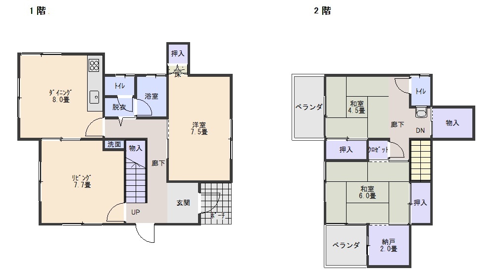 | 間取り | 4DK 1F DK8、洋7.5、洋7.7、 浴室、脱衣、トイレ 2F 和4.5,和6,納戸2,トイレ ※増築部分有(未登記) |