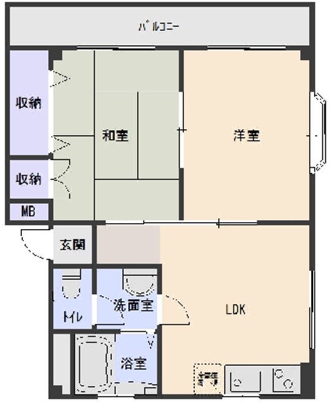 | 間取り | 2DK (51.93㎡) DK9.5、洋6、和6、浴室、 洗面、トイレ、ベランダ |