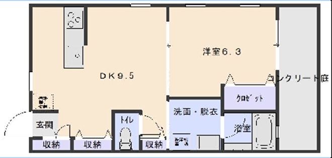 | 間取り | 1DK DK9.5、洋室6.3、浴室、洗面脱衣、 トイレ、バルコニー、ロフト |
